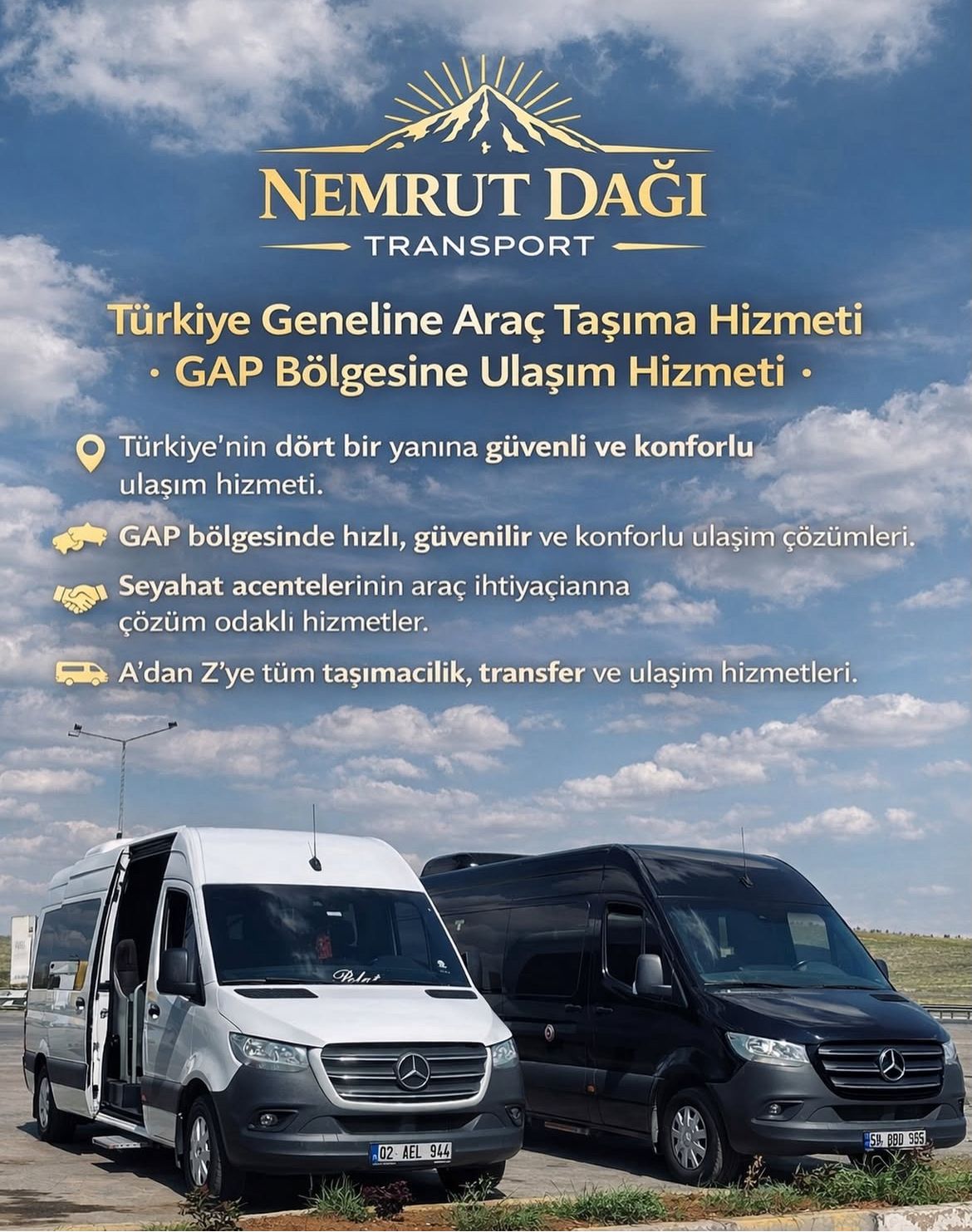 Modern ve konforlu araçlarımızla Nemrut Dağı başta olmak üzere Adıyaman, Kahta ve GAP bölgesindeki tüm turistik noktalara ulaşım sağlıyoruz.